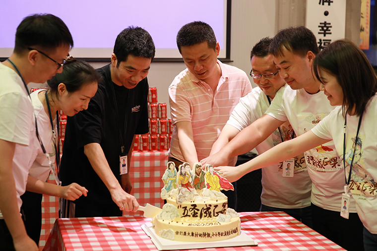 晚上(shàng),熱鬧的晚宴拉開(kāi)序幕,新事業部所在公司同事,及集團在甯波的中層以上(shàng)幹部約300人(rén)到場(chǎng)慶祝。在現場(chǎng)熱烈的掌聲中,湯總羅總和(hé)五個(gè)新事業部負責人(rén)上(shàng)台切開(kāi)寓意着圓滿和(hé)喜悅的“五聖成正果”蛋糕,同事們許下對新事業部的祝福,共享這一美好時(shí)刻。